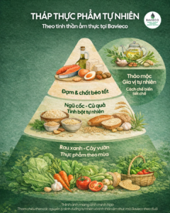 Trong bối cảnh ngày càng nhiều người quan tâm đến lối sống lành mạnh, dinh dưỡng cân bằng được xem là nền tảng quan trọng để duy trì sức khỏe lâu dài. Theo bộ Tháp dinh dưỡng do Bộ Nông nghiệp và Bộ Y tế Mỹ công bố, áp dụng cho giai đoạn từ năm 2025 – 2030 (Dietary Guidelines for Americans 2025–2030) thì rau xanh, củ quả và thực phẩm tự nhiên được xem là nền tảng của một chế độ ăn cân bằng, giúp cơ thể hấp thu dinh dưỡng nhẹ nhàng và bền vững. Tháp dinh dưỡng đóng vai trò như một khung tham chiếu giúp xây dựng chế độ ăn hợp lý, ưu tiên thực phẩm tự nhiên và sự hài hòa giữa các nhóm chất. Đây cũng chính là tinh thần mà ẩm thực tại Bavieco hướng tới.